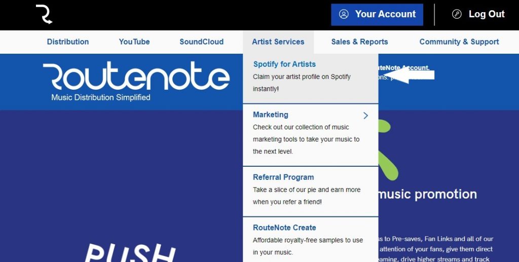 To claim your Spotify artist profile through RouteNote, either head to this link or go to the Artist Services tab of your RouteNote account and select Spotify for Artists.