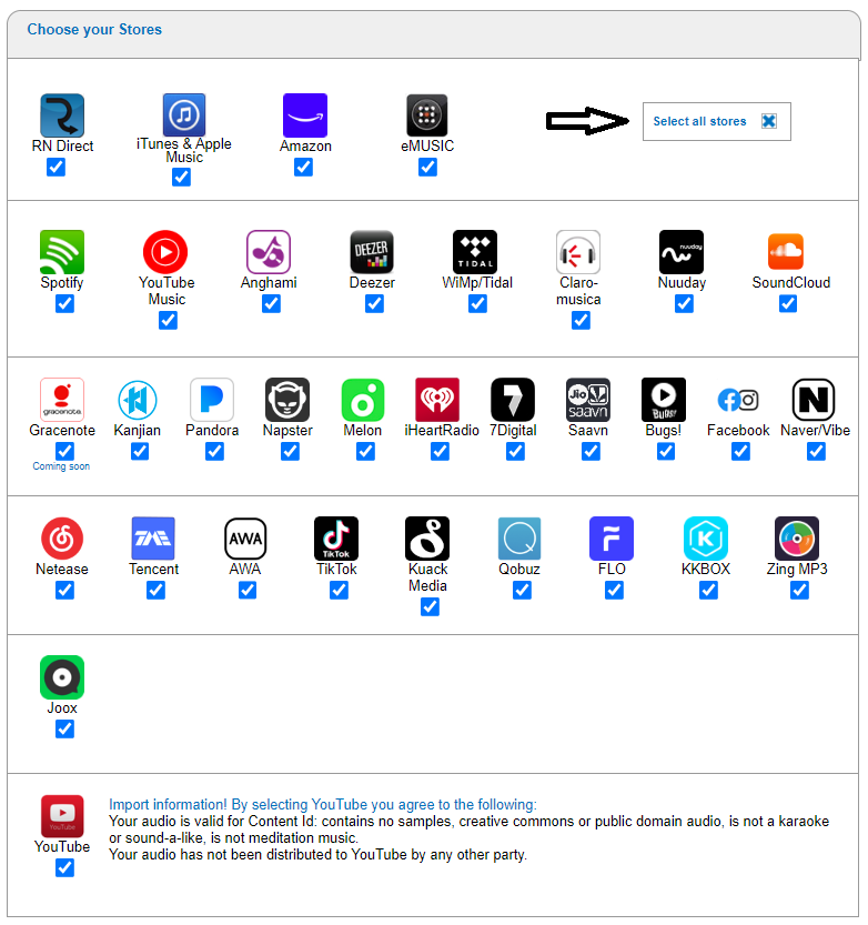If you want your release on all stores, just make sure the Select all stores box has been marked, as shown below.